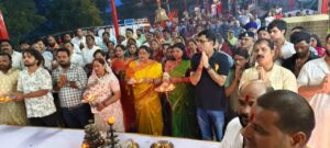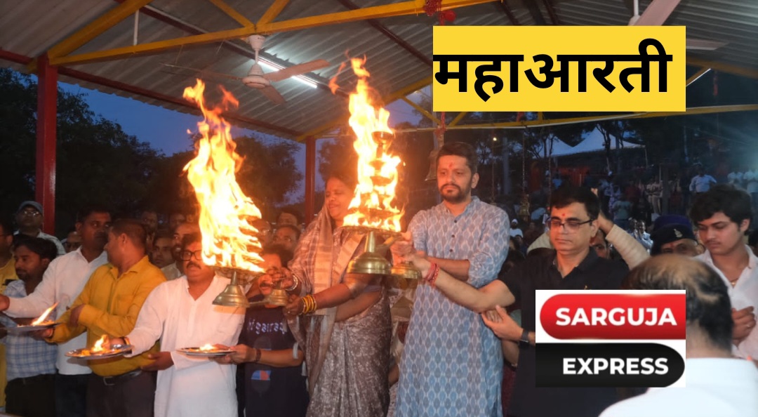 महा आरती में महापौर श्रीमती मंजूषा भगत, जिला पंचायत सदस्य श्रीमती दिव्या सिंह सिसोदिया, आदितेश्वर शरण सिंहदेव,