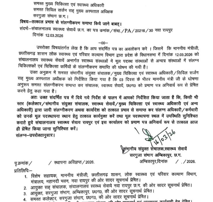 संभागीय संयुक्त संचालक, स्वास्थ्य सेवाएं सरगुजा संभाग अंबिकापुर द्वारा जारी आदेश के अनुसार यह निर्णय स्वास्थ्य संचालनालय छत्तीसगढ़ के निर्देश पर लिया गया है। संचालनालय स्वास्थ्य सेवाएं द्वारा जारी पत्र के संदर्भ में बताया गया है कि छत्तीसगढ़ शासन के लोक स्वास्थ्य एवं परिवार कल्याण विभाग के मंत्री ने 12 मार्च 2026 को विधानसभा में घोषणा करते हुए स्वास्थ्य संस्थाओं में मूल पदस्थापना से अन्यत्र संस्थानों में किए गए संलग्नीकरण को समाप्त करने की बात कही थी।